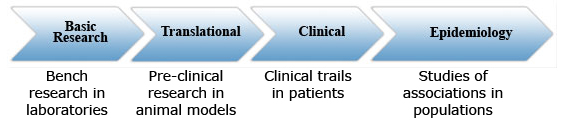 Translational researchers attempt to bridge the gap between basic science or laboratory experiments (bench science) and clinical applications (bedside). Going back to our arrow image, you can see we have been discussing what's between basic research and clinical research, moving closer to patient applications.