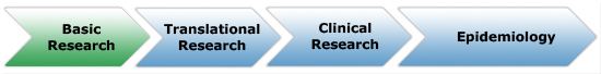 Advocates in BASIC RESEARCHBasic research (also called bench research or fundamental or pure research) has as its primary objective the advancement of knowledge and the understanding of the relationship among different ideas. It is exploratory and often driven by the researcher's curiosity, interest, and intuition. Because of this, basic research is sometimes conducted without any practical end in mind, although it often has unexpected results leading to practical applications. Going back to our arrow image, you can see we have been discussing what's on the far left, which is the beginning of the process. When you hear the term "bench to bedside" the "bench" part of the research refers to basic research, because this work takes place in a lab at a "bench". |